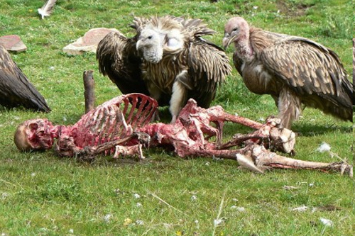 يقدم أهل التبت جثامين موتاهم صدقاتٍ للطيور. حيث يتم تقطيع جثة الميت إلى شرائح، ثم توضع في مكان مرتفع، كقمة جبل أو هضبة عالية، لتولم عليها الطيور والجوارح الجائعة.